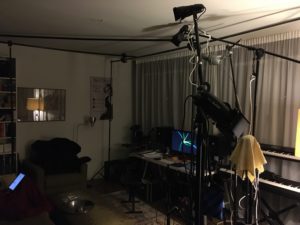 We filmed multiple takes of my live performance.  Once again we selected the best single take and sent it to Matthew to record his parts. Don spoke to Matthew and described the lighting and “stage” setup required so he could match his living room film set to ours.